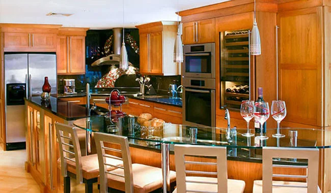 Special Design Elements:Glass door inserts, accent lighting, wine refrigerator is located at the end of the island for easy access from the living area, secondary prep sink
