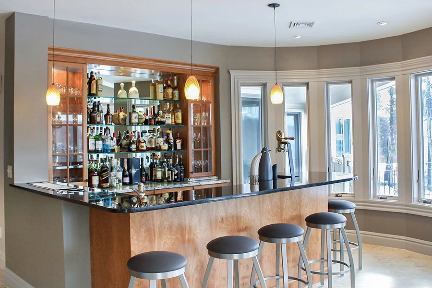 A custom bar and entertainment space are perfect for hosting your next event. Glass wall cabinets will hold all of your glassware. Glass shelves allow you to proudly display top shelf liquor or any other décor you might have. A built-in entertainment center with unique recessed lighting is sure to stun all of your guests.