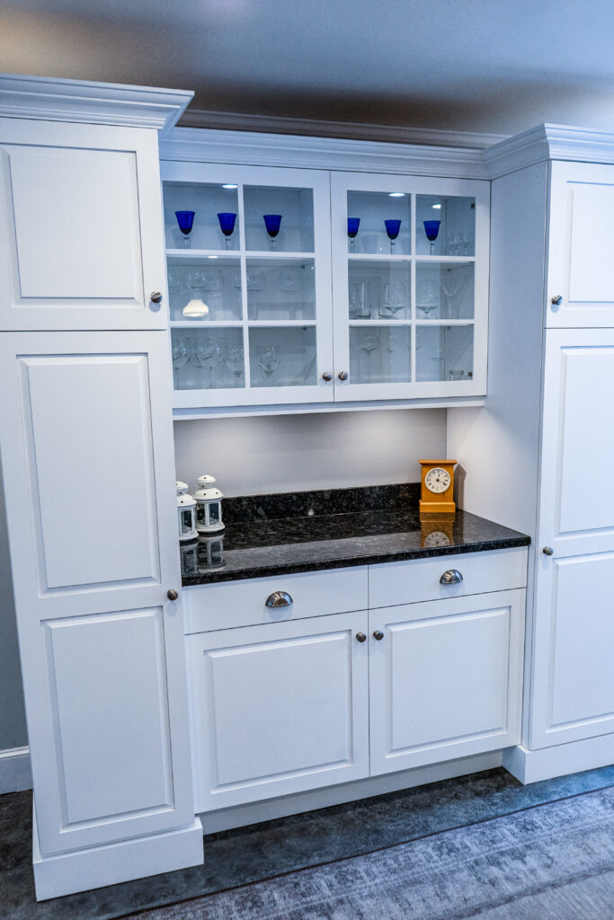 This mini-bar brings in a fresh, inviting look to this white kitchen. Just under the brand new countertops are drawers customized to meet the home owner’s need for storage and organization. There is plenty of storage for plates, utensils, dinner napkins, and more that can easily be tucked away to keep this white kitchen looking brand new!