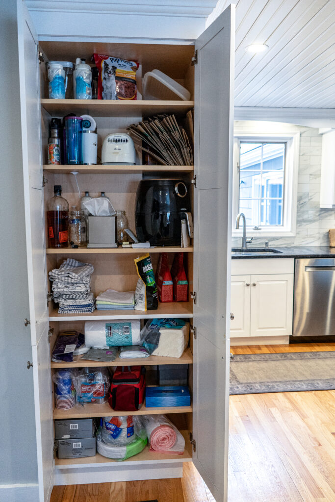The home owner has the perfect mini-pantry to store all of their necessities. This one pantry now stores pet food, disposable plates and utensils, lunch boxes, dry goods, kitchen towels, paper towels and more. Maximize space by getting organized today with this must-have kitchen feature.