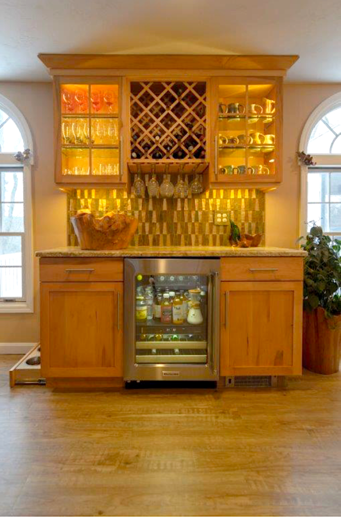 - Gorgeous bar with matching birch cabinets and stunning mosaic backsplash