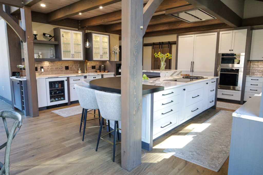 This white kitchen design is a dream come true! We set out to give this space an amazing makeover, starting with a fabulous white kitchen island. Featuring ample seating for up to five people, it also features a built-in stovetop, glass cabinets, and custom white cabinets. This stove orientation allows the cook to interact with family and guests. Plus this kitchen island keeps the family electronics charged since we tucked several electrical outlets within the island. Sleek black metal accents add an elegant touch to this white kitchen design! Whether you’re hosting your holidays or throwing a dinner party, this beautiful kitchen renovation will be the place to be!