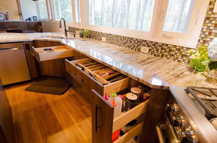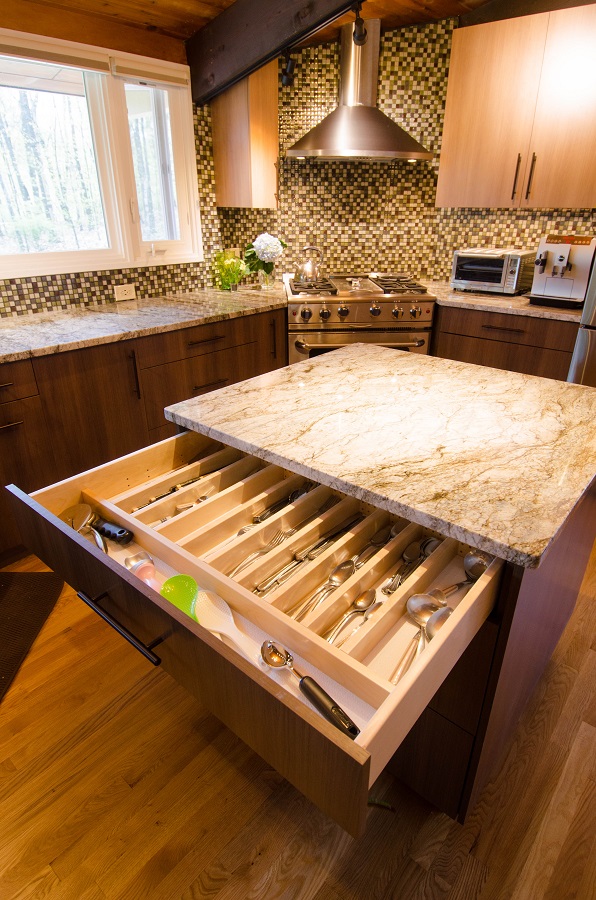 | In summary –White cabinetry with honed black countertops really give an excellent contrast in this Acton MA Kitchen. Corner range and angled farm house sink provide a fabulous amount of countertop space and a great amount of drawer storage. |