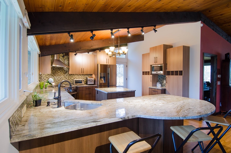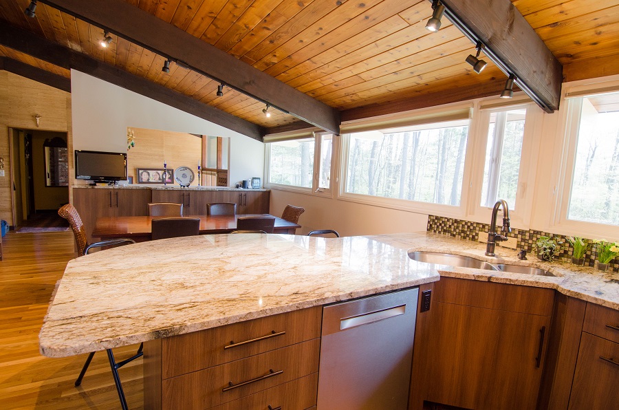 | Acton MA Kitchen Remodel Stunning white cabinetry lighten up this Acton MA kitchen remodel space. Corner range is a great use of corner space in this Acton MA kitchen space while providing a great amount of countertop space . Lots of drawer storage added to kitchen with organization for spatulas and spices so everything has a place. Plenty of cabinet storage for pots, pans, mixing bowls, Tupperware, serving dishes, small appliances and anything else the owner could need. Lovely curved seating area for four people, perfect for conversation in this Acton MA kitchen remodel. Angled farmhouse sink space that is partially opened up to the dinning room letting whomever is in the kitchen still be apart of dining room conversation. Stunning black honed granite countertops and backsplash tile really provide a great contrast in this Acton MA kitchen remodel. |