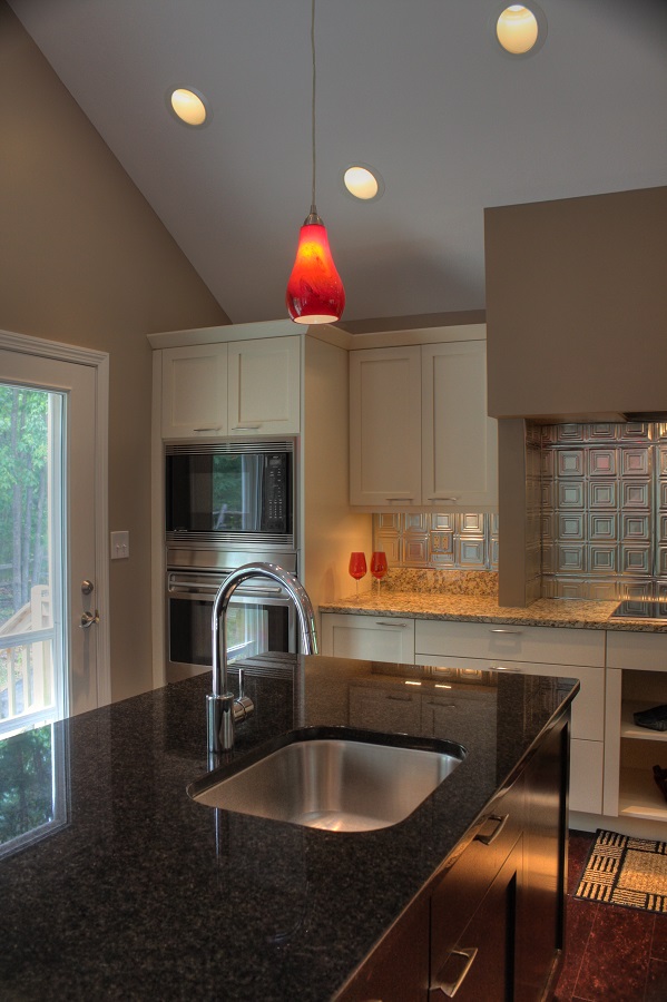 - Two toned granite countertops with tin backsplash give this Brookline MA kitchen an interesting element.