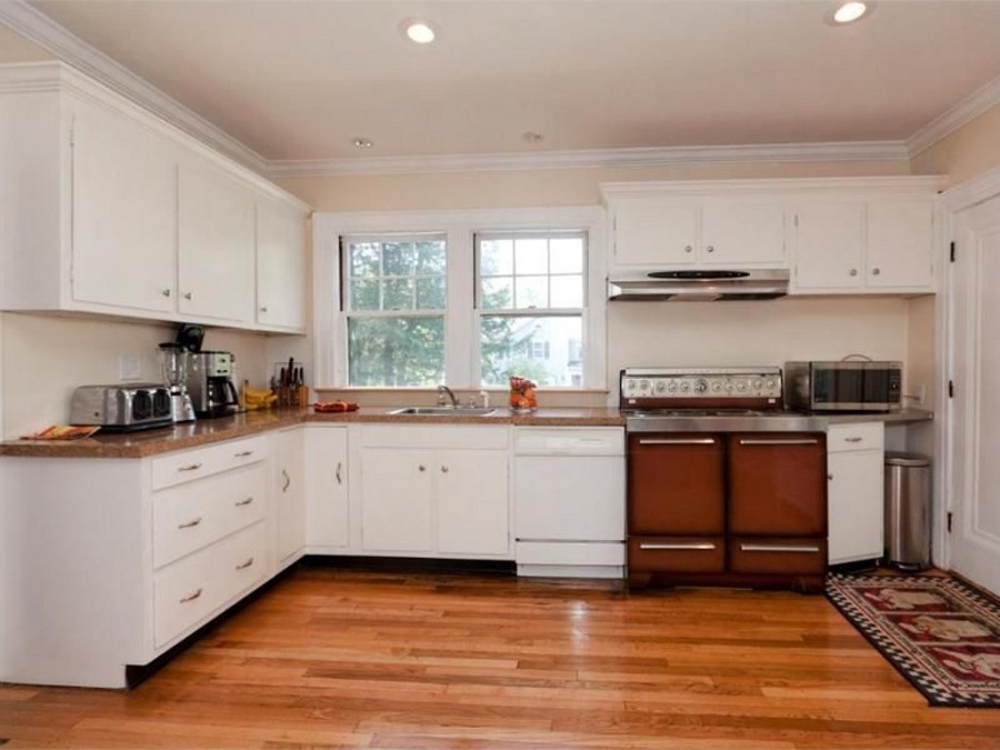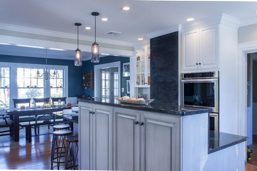 - Wall cabinets now go all the way to the ceiling, and a decorative glass door cabinet was added.