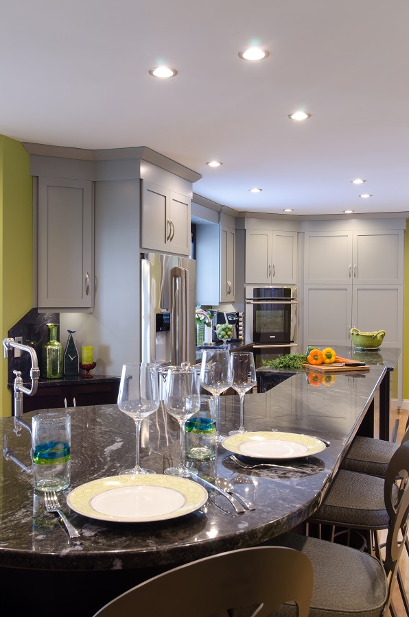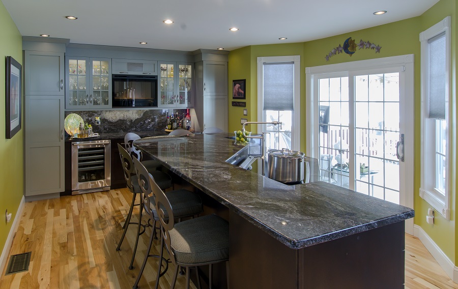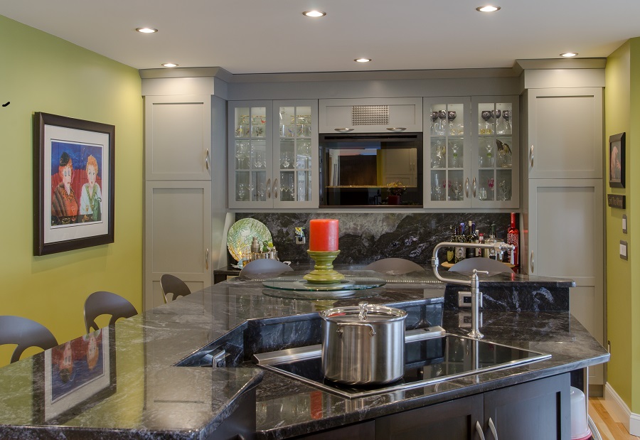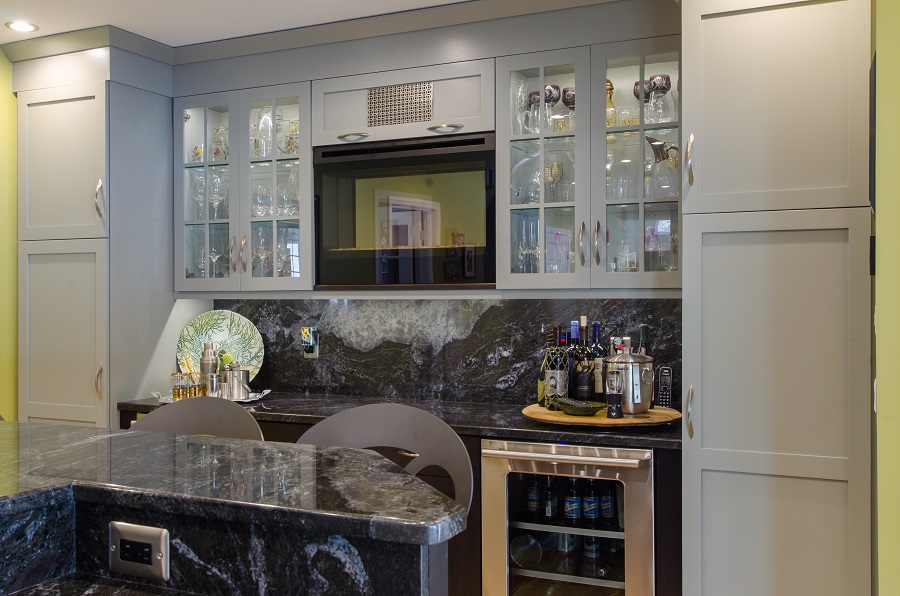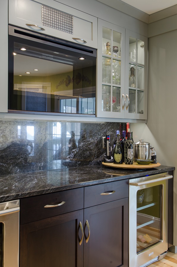 • By removing the soffit, wall cabinets can now go all the way to the ceiling, and a decorative glass door cabinet was added to the bar area.