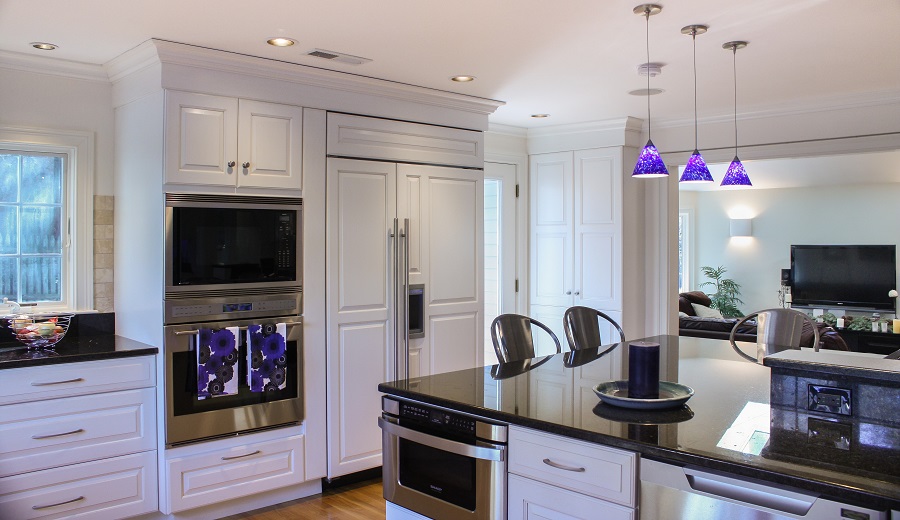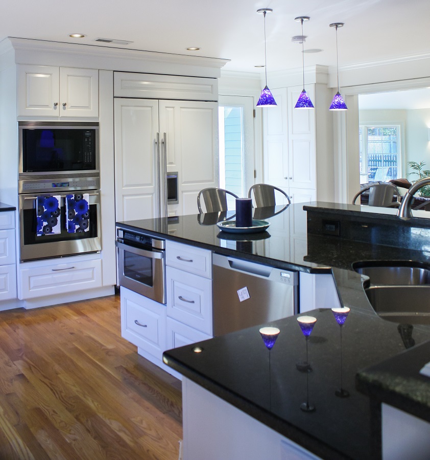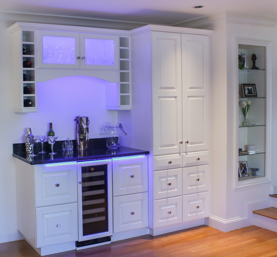 | In summary – WOW did this Wellesley MA Kitchen change! Updating the cabinetry gave this kitchen a beautiful bright clean look that still kept with the traditional feel by adding the valances and beams. Relocating the cooktop and sink give this kitchen much more storage and countertop space. Adding a table off the island provides a great place for the family to have a quick meal or just sit and relax. A beautiful bar was added which is perfect for entertaining. Blue lights are subtly placed throughout the kitchen giving it a real wow factor. |