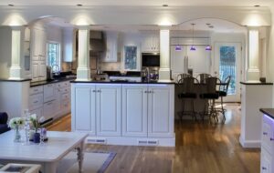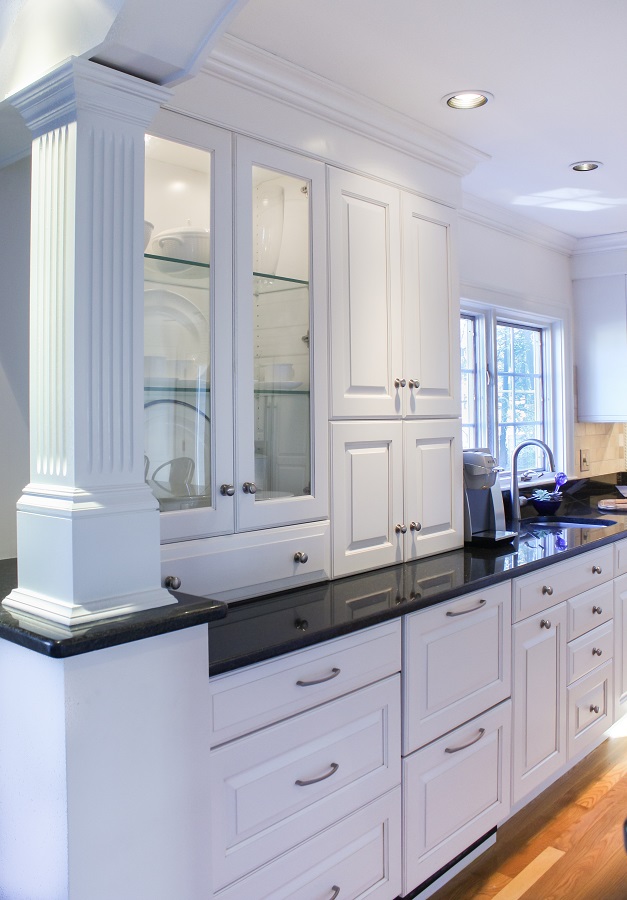 - Adding columns and valances between the two rooms gives this Wellesley MA kitchen the appearance of being one space but still keeping it separate.