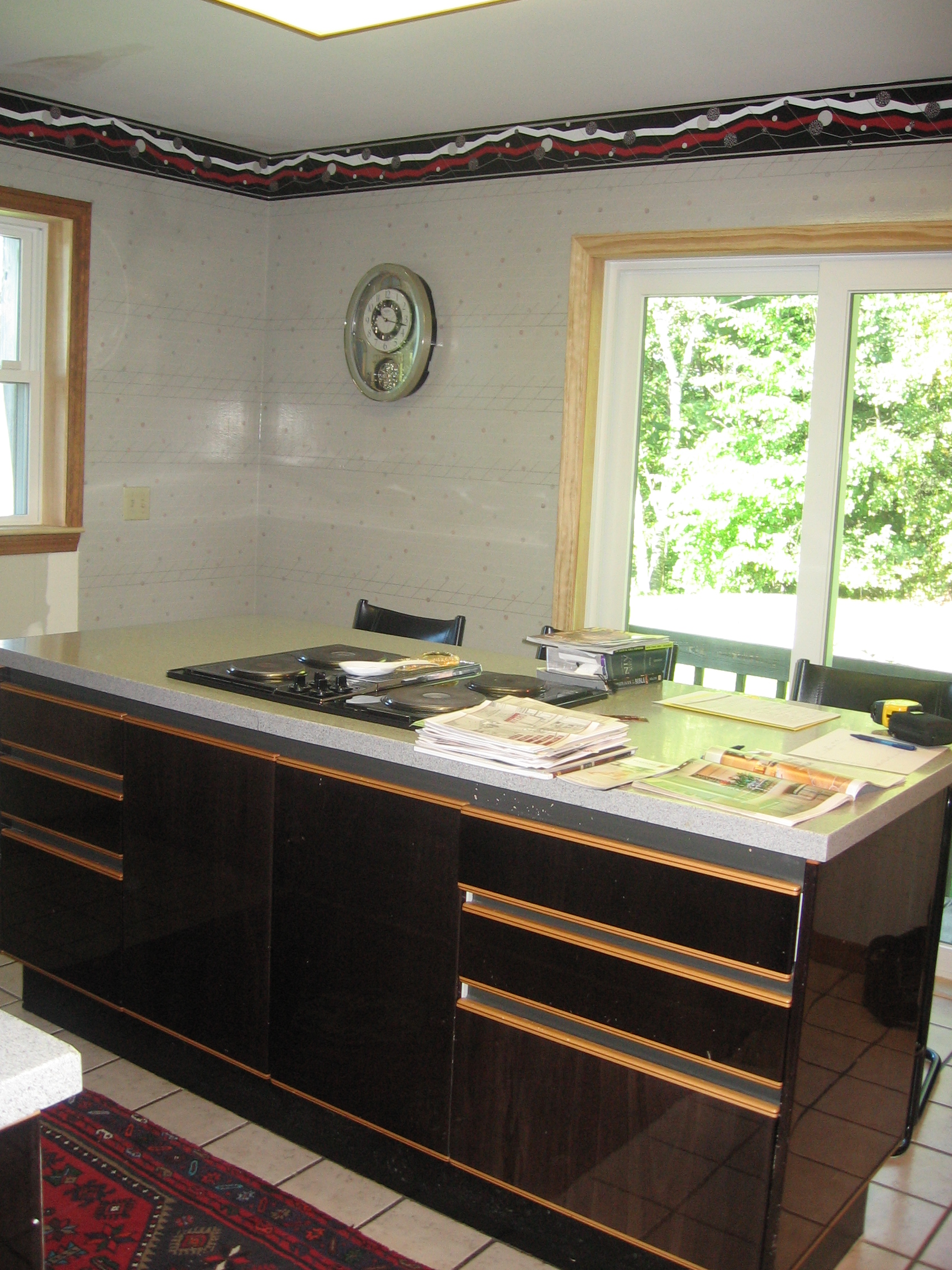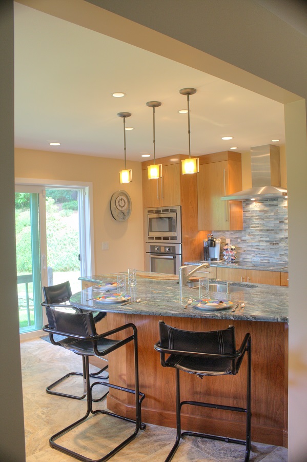 | In summary – This contemporary 1960’s kitchen transformed to a contemporary kitchen of today. Changing the configuration of the kitchen made a huge difference in the design of this Wilton NH Kitchen. Moving the cooktop to the back wall and the sink to the island give this kitchen plenty of drawer storage as well as a lot of counter space. Having seating in the island provide a great place for eating or talking to the chef while they work. |