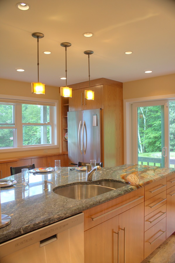 - Adding plenty of recessed lights and three pendants makes this once dark space into a beautiful well lit kitchen.