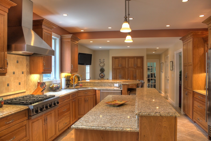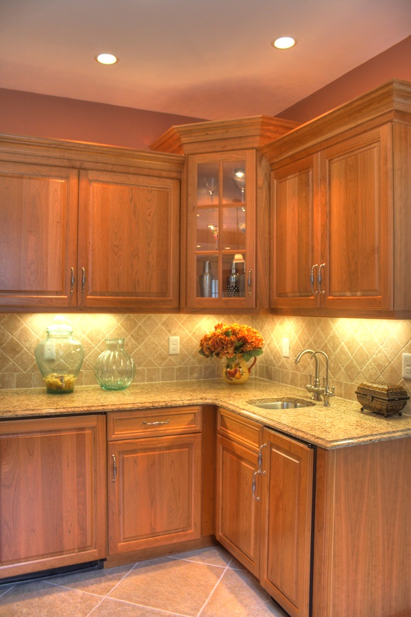 | In summary – This Chelmsford MA kitchen transformed from an outdated kitchen with dark framed cabinetry with formica countertops to a stunning cherry kitchen with granite countertops while still staying in the traditional style. Moving the cooktop allows for an amaizng backsplash with stunning accent piece and a great amount of storage space. Raised areas on the island and by the sink provide the perfect shelter from people passing through but still giving this Chelsmford MA kitchen an open feel. A bar area with glass cabinetry give this kitchen another added element. Overall this Chelmsford MA kitchen is now a functional and beautiful area the family loves to use. |