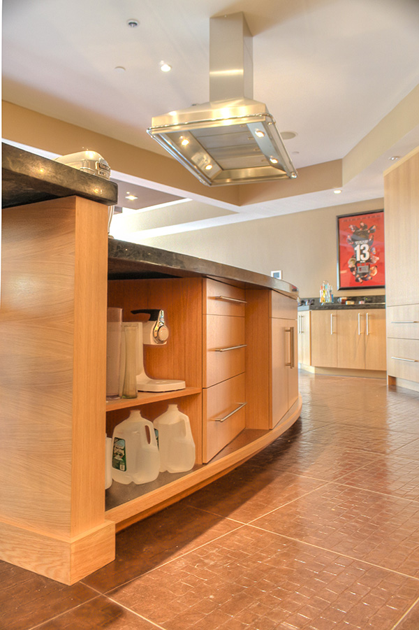 Design Features – raised counter seating, stainless steel appliances, corner sink, corner range Radius island with square, staggered cabinets