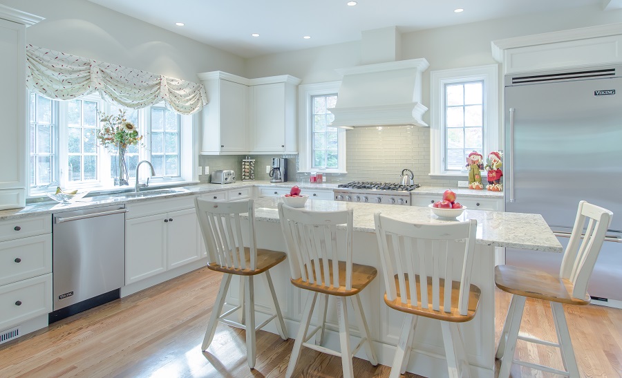 In summary – White cabinetry and light colored granite give this Newton MA kitchen remodel a bright beautiful look. Kitchen island provides storage as well as seating for four. Subtle grey tile gives a great contrast to the white cabinetry.