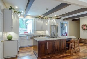 Two toned kitchen using white paint and a dark stained wood to match the exposed beams give this Bedford NH Remodel an amazing wow factor.