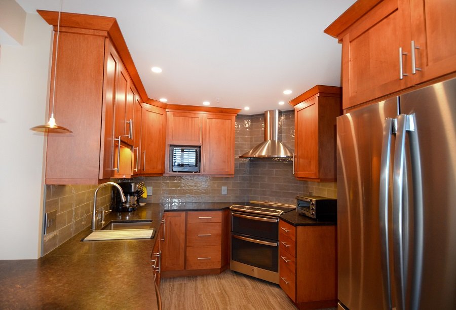 In Summary- In this newly renovated cherry kitchen remodel, Boston MA the natural cherry and gray accents throughout the kitchen interlaces wonderfully in the kitchen design. From the floor to the ceiling the colors interact with one another in a unified style. The honed countertops stretch throughout the perimeter of the small kitchen remodel into a circular seating area at the end comfortable seating four. The Stainless steel sink is plenty deep enough to fit large pots and pans to clean. It also has a magnetic drying rack that attaches and detaches when you need it. The microwave fits in the cabinet space just perfectly and is the right size for a family of two. The double oven and fridge are new and match the rest of the stainless steel appliances. There is plenty of storage space and tall pantry cabinets to hold all the homeowners pantry needs. The lighting weaves throughout the kitchen remodel from recessed lighting to backslash lighting. The floor is a new durable vinyl that holds up in harsh New England climates. It’s stunning and adds to the unique style kitchen remodel in Boston Ma.