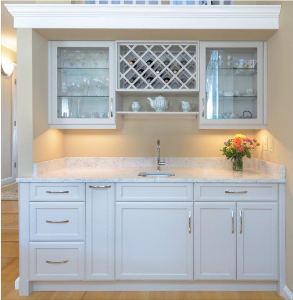 The ornate bar serves as the statement piece of this kitchen. A large wine rack sits in the middle with an open shelf underneath to display any décor. Two glass panelled cabinets next to the rack display glassware. Recessed lighting showcases the gorgeous white granite countertop with a small built-in sink. The bottom half of the bar is all cabinets and drawers of varying sizes for extra storage.