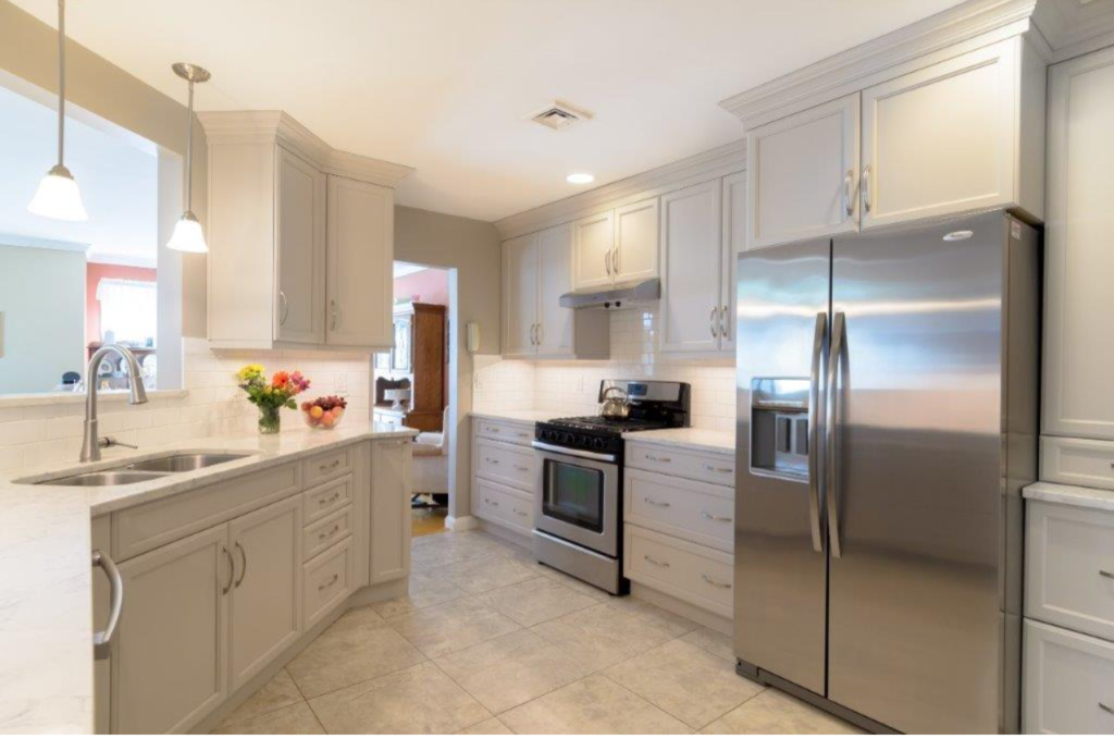 This Small White Kitchen appears larger thanks to our design for an all-white space. White shaker cabinets complement a white subway tile backsplash. These white granite countertops are the perfect accent for white cabinets. A full height backsplash creates a dreamy feel. The cabinets are strategically placed at the perfect height.