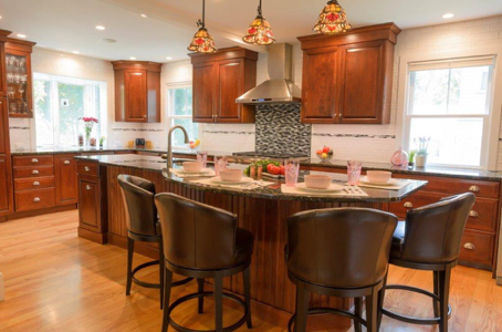 This Traditional Cherry Kitchen remodel is a classic; it never goes out of style! The darker toned cabinets line the walls of the space and panel the island. In the corner, there are two floor to ceiling pantry cabinets for all of your groceries. A glass paneled cabinet sits next to those for all of your decorative glassware.