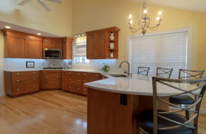 Stainless steel appliances fit right into the space, not sticking out at all. The warm tones of the cabinets and white and grey hues of the granite counter are highlighted with recessed lighting. A gorgeous chandelier hangs over the peninsula to brighten up the space even more.
