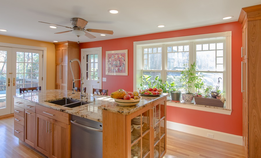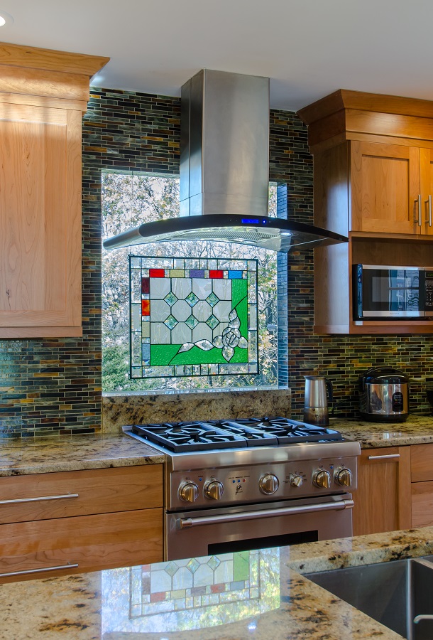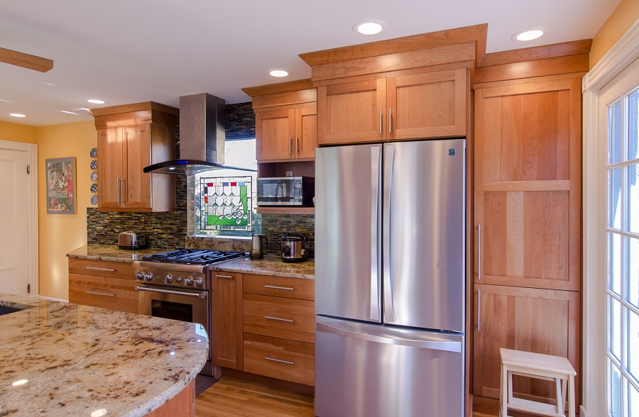 | In summary –Natural cherry cabinetry with stainless steel appliances, large island with seating and a stunning backsplash with window behind the cooktop truely make this Weymouth MA kitchen remodel unique. |