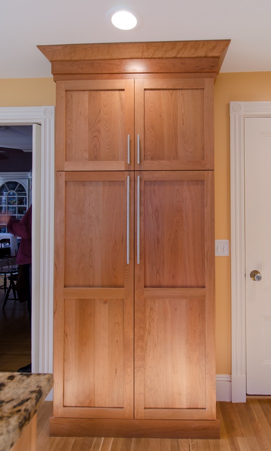 | Weymouth MA Kitchen Remodel Stunning natural cherry cabinetry brings warmth to this Weymouth MA kitchen remodel Stainless steel appliances as well as a large stainless steel sink in the island are a great compliment to this Weymouth MA kitchen remodel. Lots of drawer storage added to kitchen with organization for spatulas and spices so everything has a place. Plenty of cabinet storage for pots, pans, mixing bowls, Tupperware, serving dishes, small appliances and anything else the owner could need. Multicolored back splash tile really compliments the granite and the stain glass piece behind the range bring a beautiful unique element to this Weymouth MA kitchen remodel. Island seating for four is a great place for a morning cup of coffee or a cozy dinner with loved ones. Two large pantries are a great place for storage and dont take up much space in this Weymouth MA kitchen remodel. |